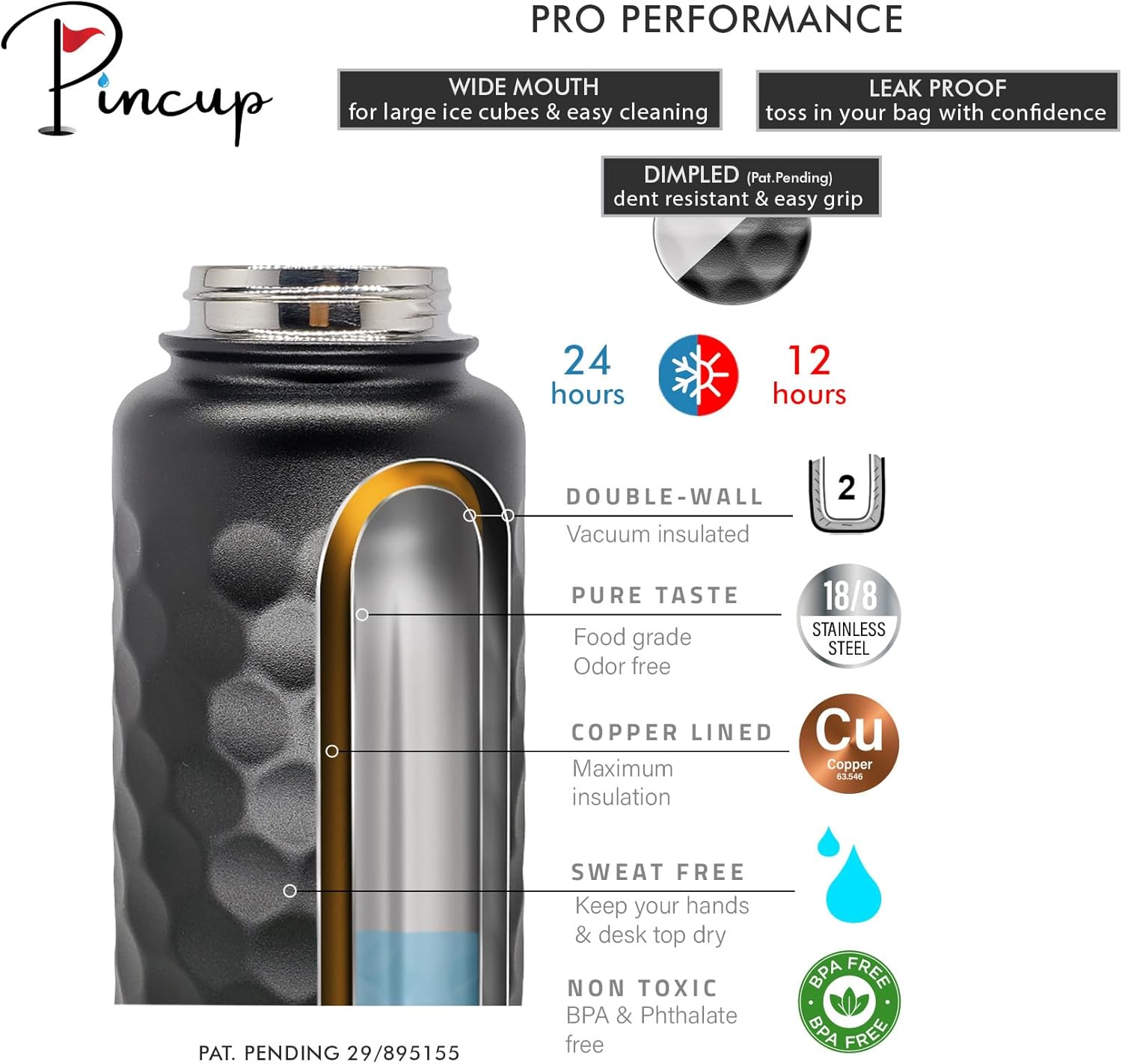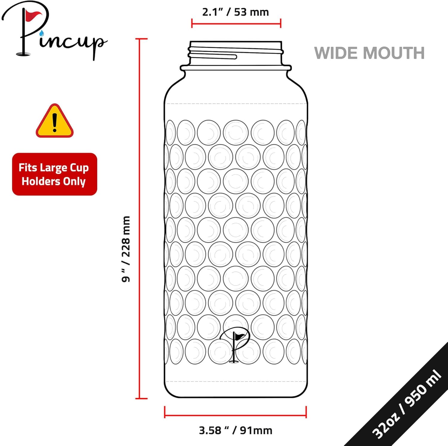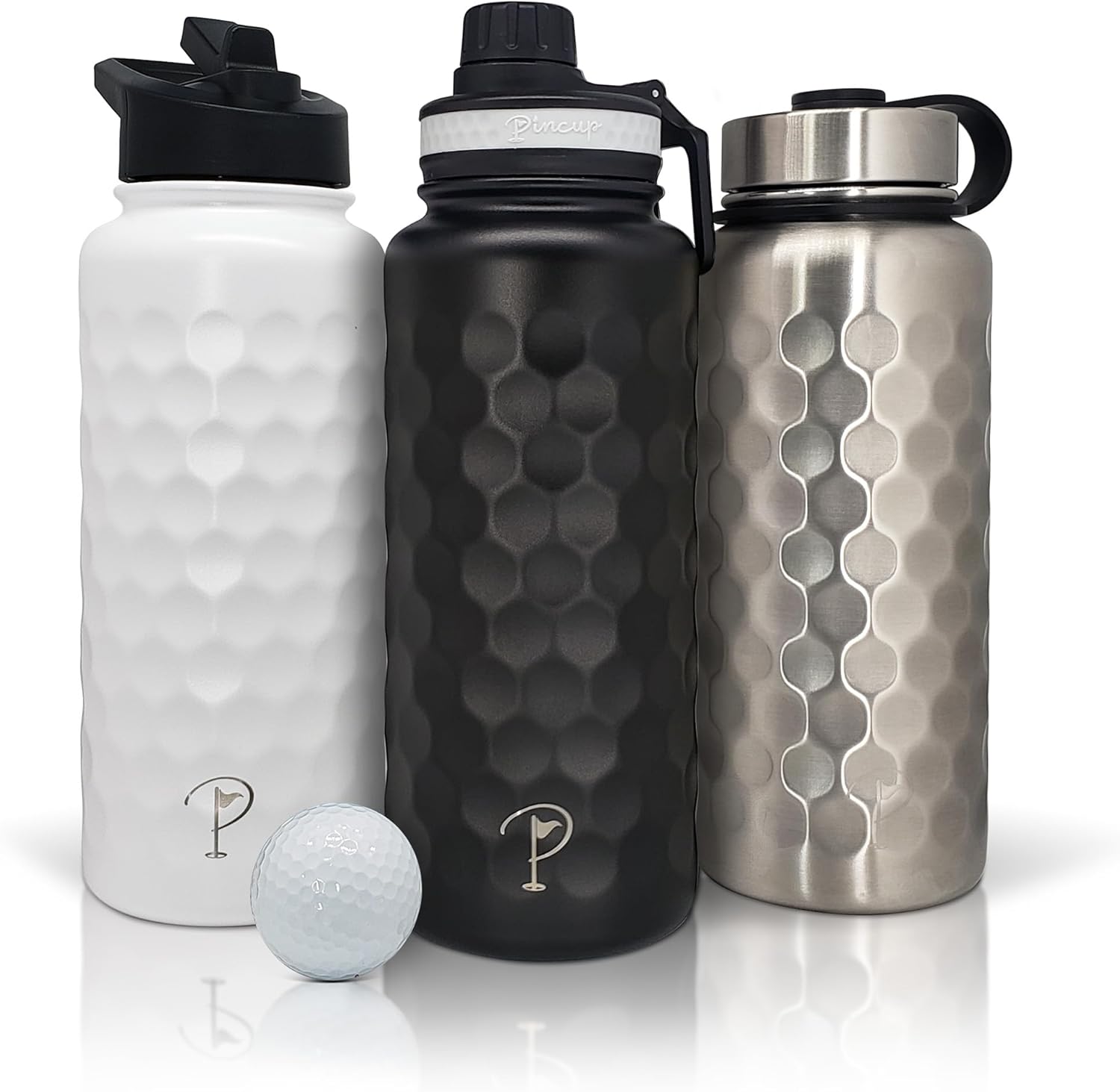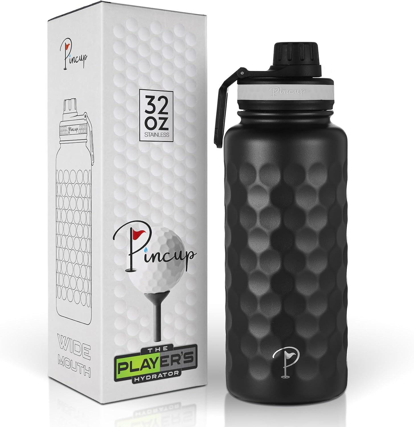 • PINCUP - THE PLAYER'S HYDRATOR: The best insulated water bottle for golfers, our 32oz round flask bottle has a dimpled golf ball texture. Unique & easy to grip, it’s the preferred hot/cold pro performance golf flask metal water bottle for golfing men & women.