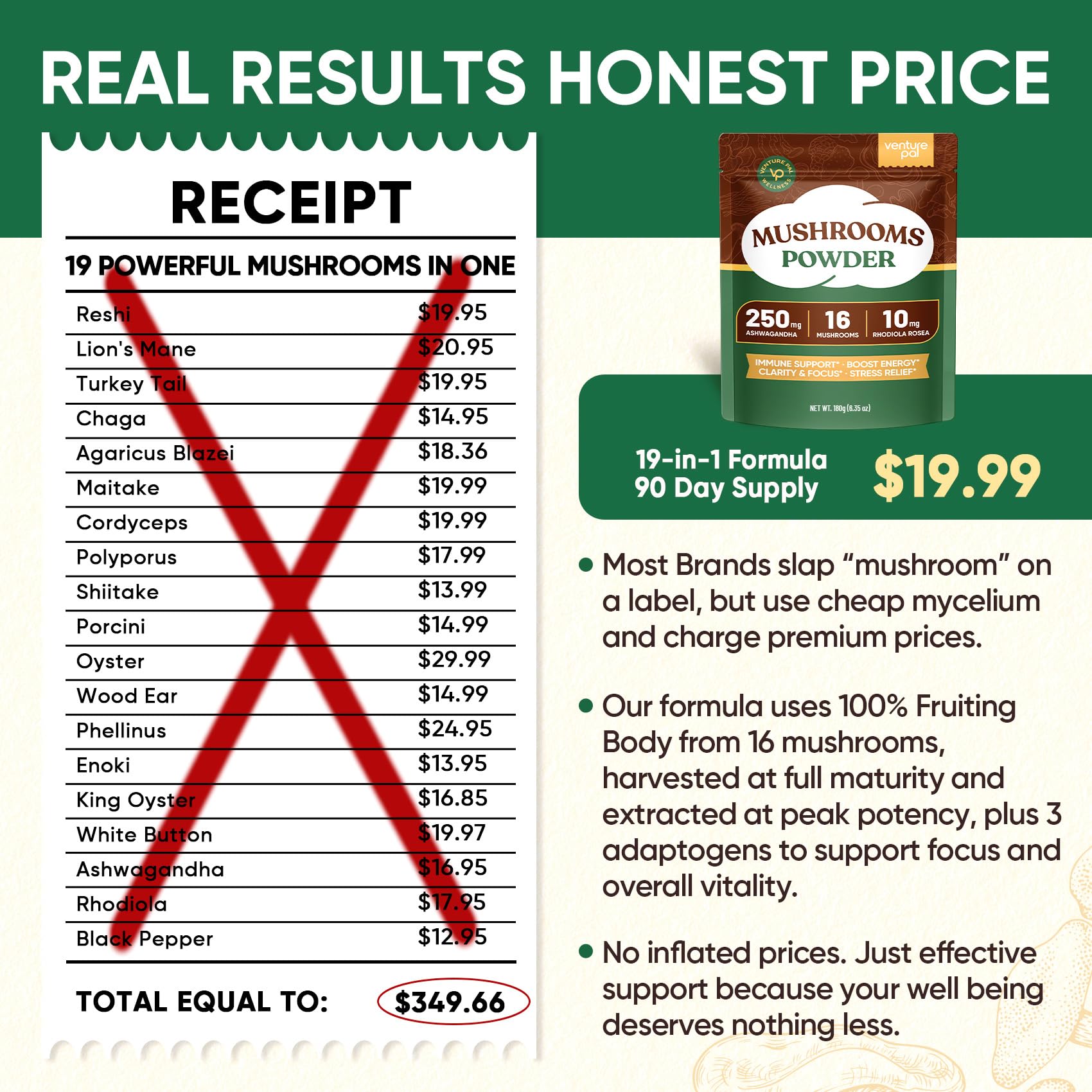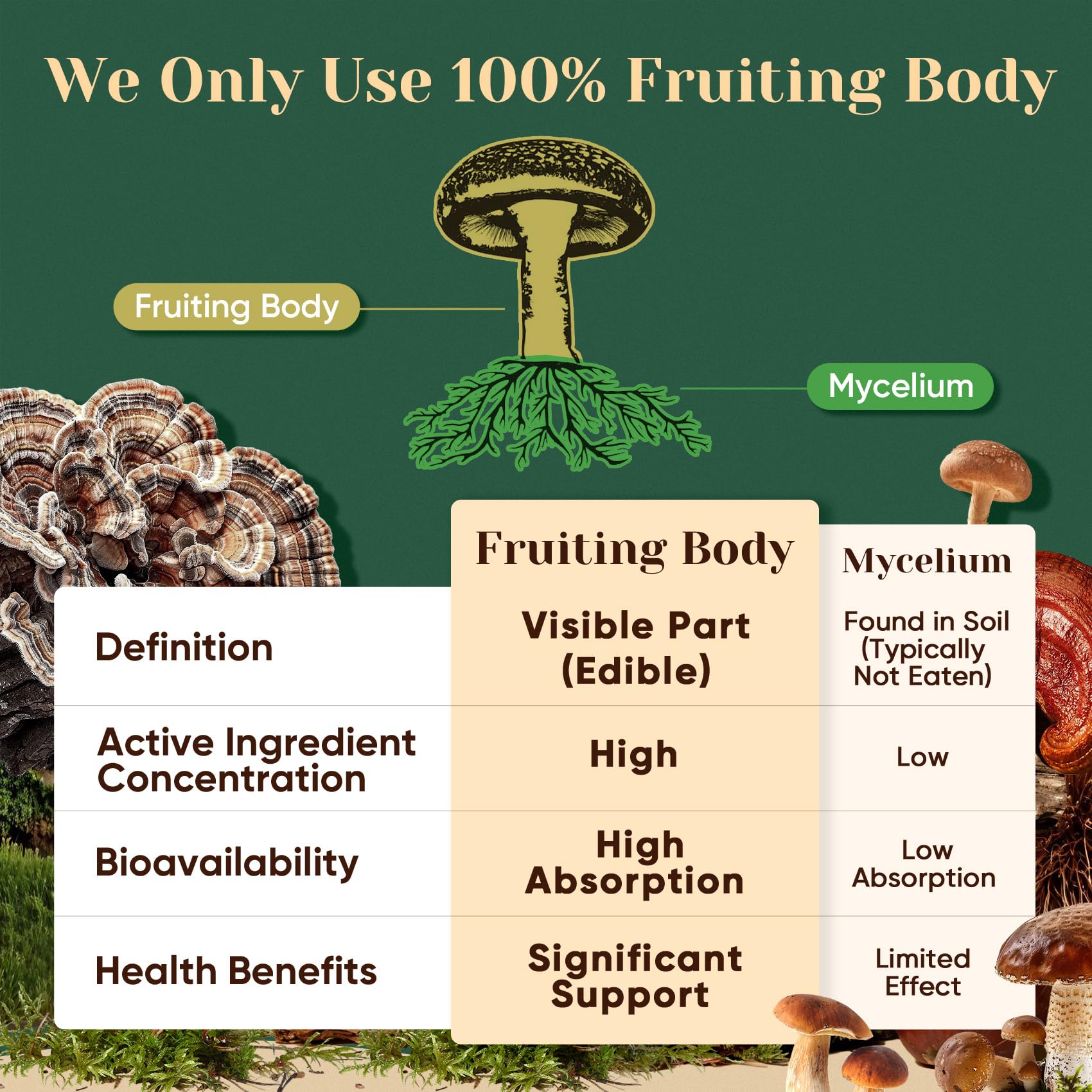 PREMIUM FULL-SPECTRUM 16-MUSHROOM EXTRACT BLEND: Packed with Lion's Mane, Chaga, Turkey Tail, Reishi, Shiitake, King Trumpet, Cordyceps, Willow Bracket, Oyster Mushroom, Mesima, Agaricus Blazei, Maitake, Wood Ear, Enoki, White Button, and Porcini, each serving delivers 17,300mg of fresh mushrooms with a potent 10:1 extract ratio. Made from 100% fruiting bodies—no fillers, no mycelium—for maximum effectiveness