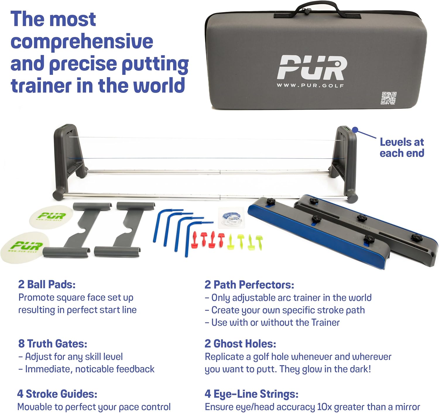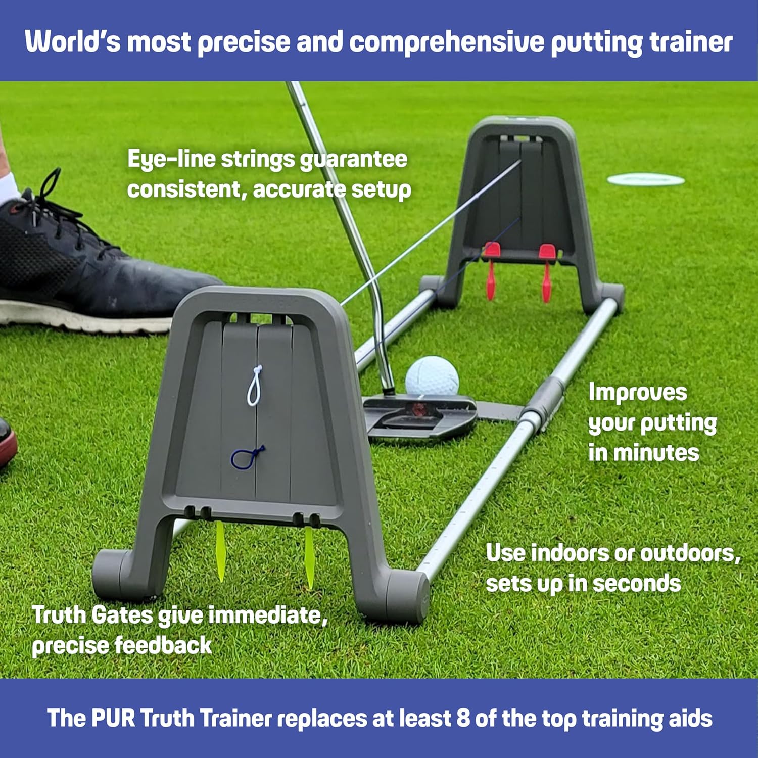 Golf Putting Trainer: Pur Truth Replaces 8 Most Used Golf Putting Aids - Premium Mastery System - Perfect Eyeline Accuracy, Stroke Path, Length and Arc. Precise Square Face Training.