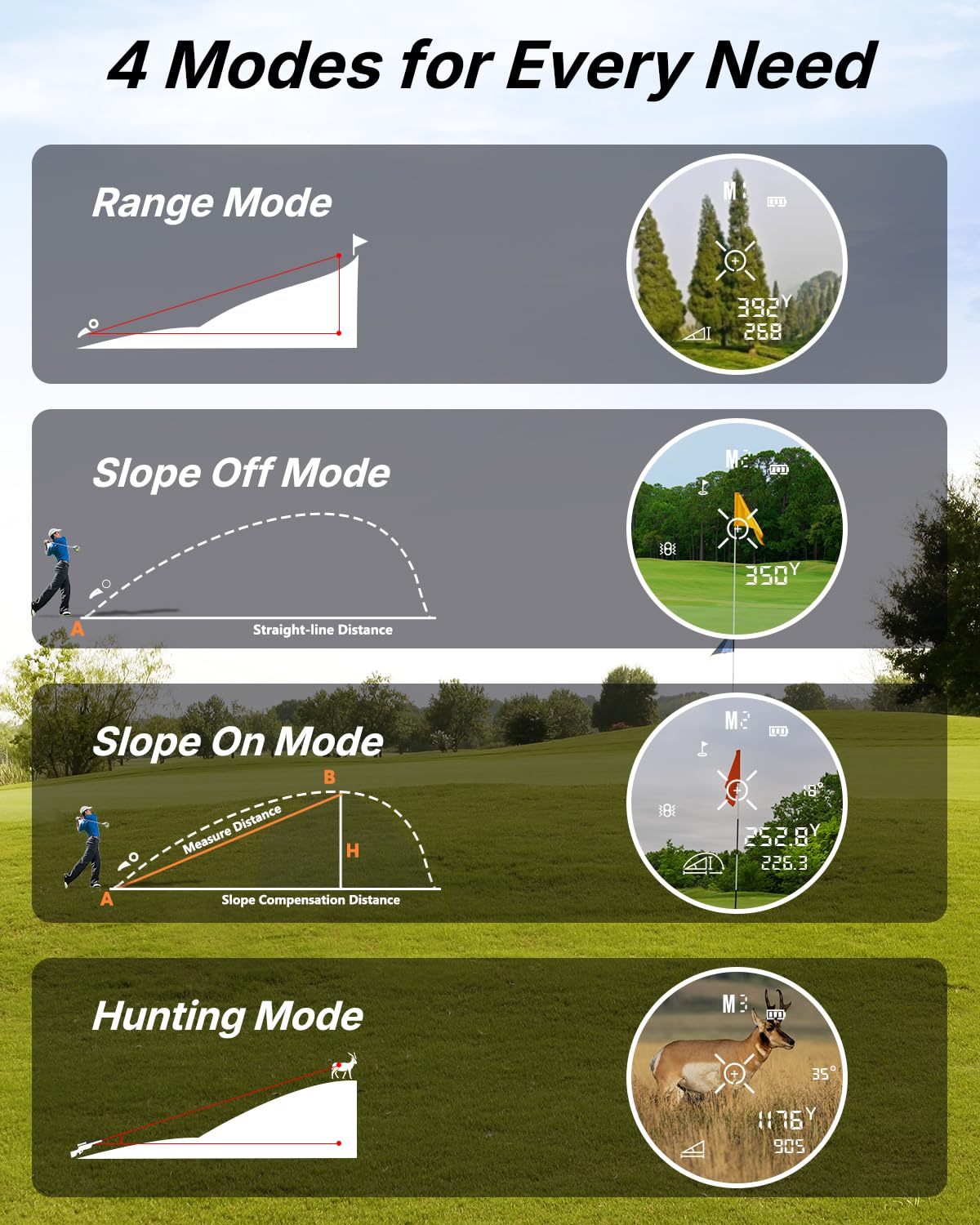 • 4 Measurement Modes: M1 Hunting Mode (measure the straight-line distance, horizontal distance, angle, and continuous scan measurement). M2 Non-slope Mode (Flag Locking and Vibration). M3 Slope Mode (Slope Compensation, Golf Flag Locking, and Vibration). M4 Vertical Distance Mode (Straight-line Distance and Vertical Distance)