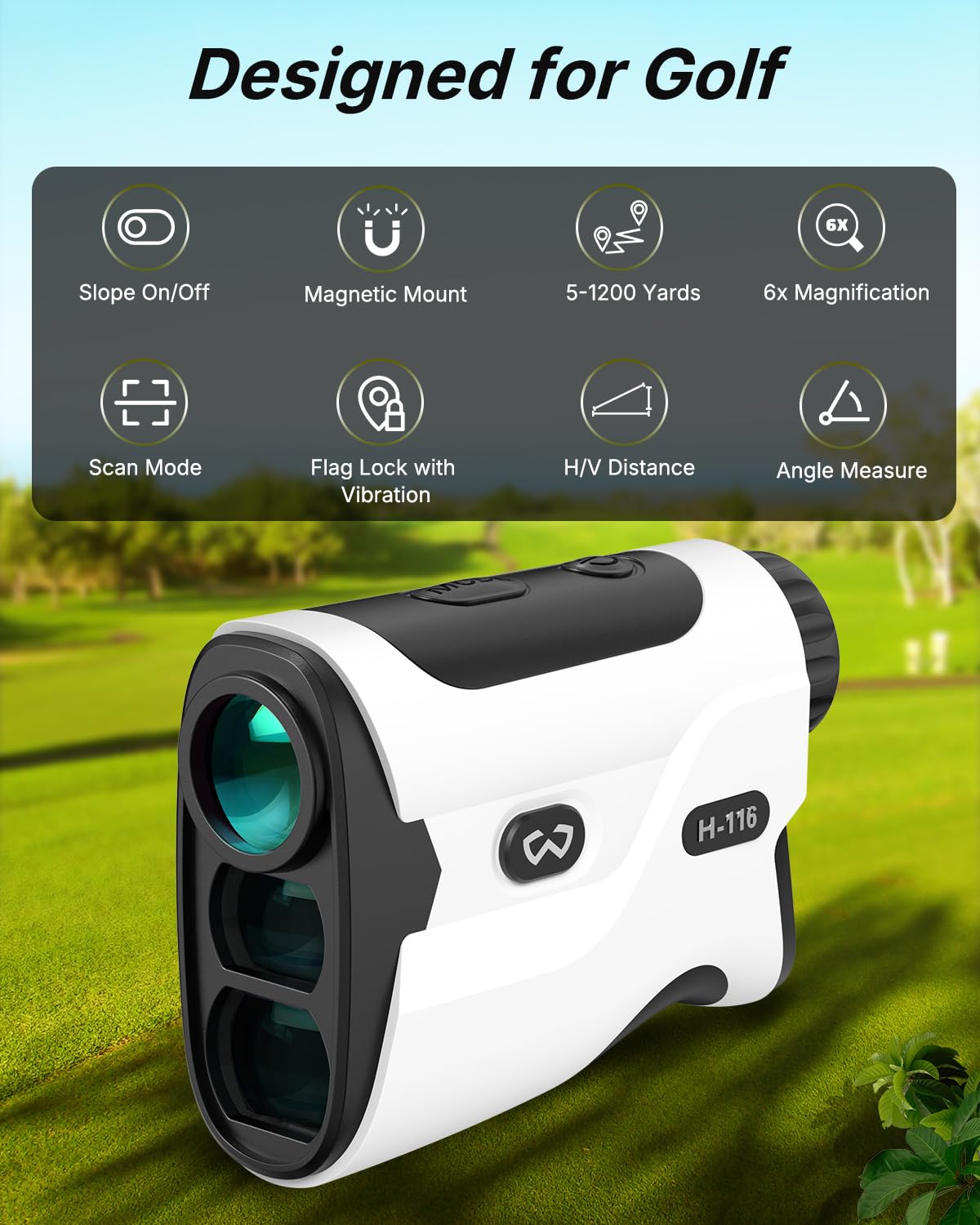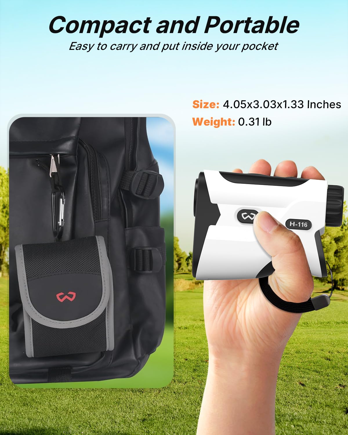 WOSPORTS range finder provide accurate 1200-yard measurements and flagstick vibration. It's a compact, lightweight rangefinder that fits comfortably in your hand and pocket. Durable rangefinders with rubber armor can withstand drops and shocks.