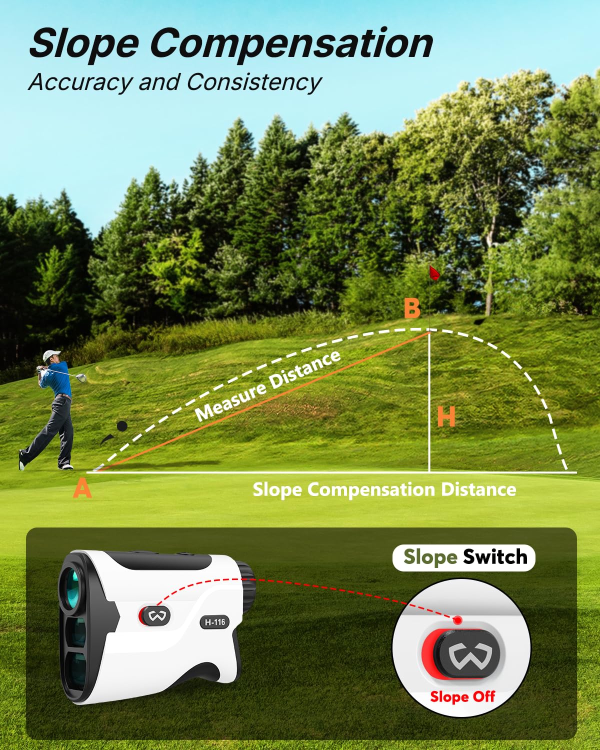• 1200-Yard Golf Rangefinder with Slope Switch: WOSPORTS range finder features slope compensation providing more accurate distance readings, especially on hilly courses. The slope switch makes it for Tournament legal play